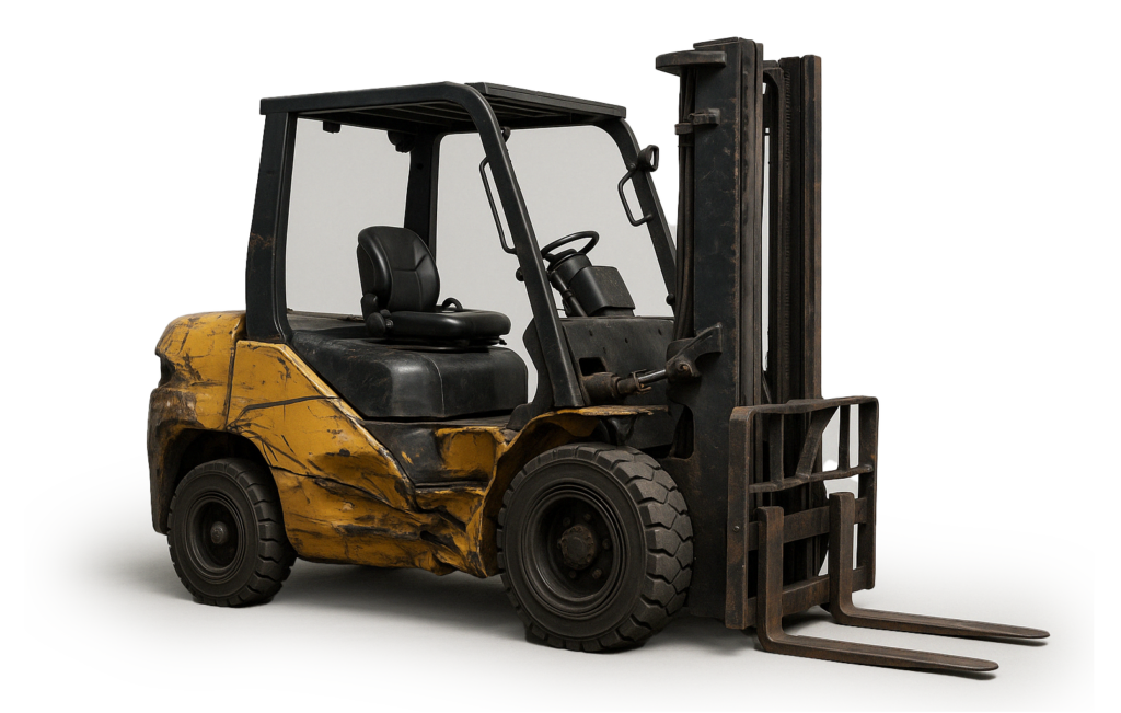 Equipment involved in rollovers, crashes, or impacts resulting in bent frames or visible structural breakage.